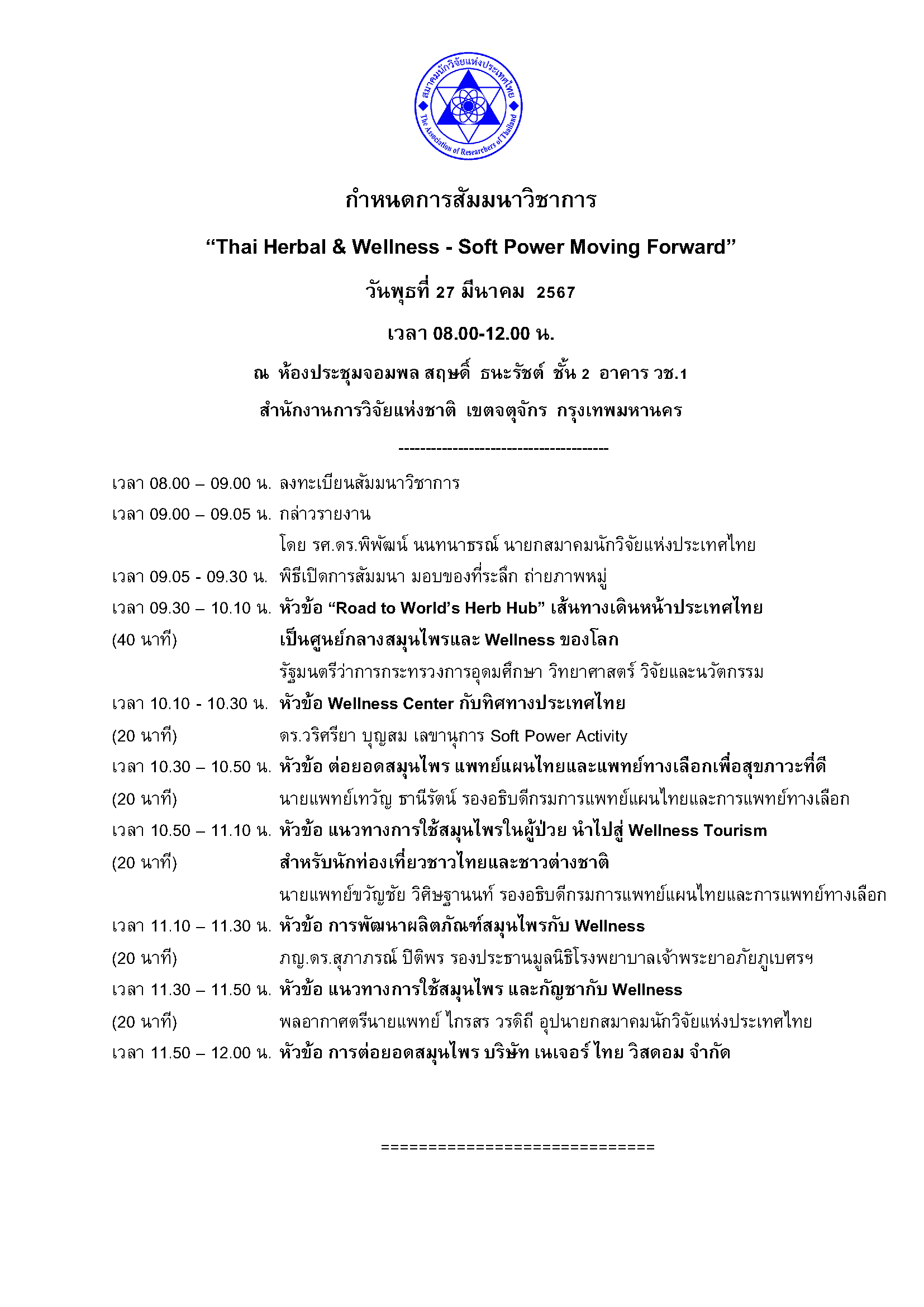 ขอเชิญร่วมฟังการสัมมนาวิชาการ Thai Herbal & Wellness-Soft Power Moving Forward